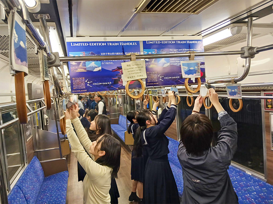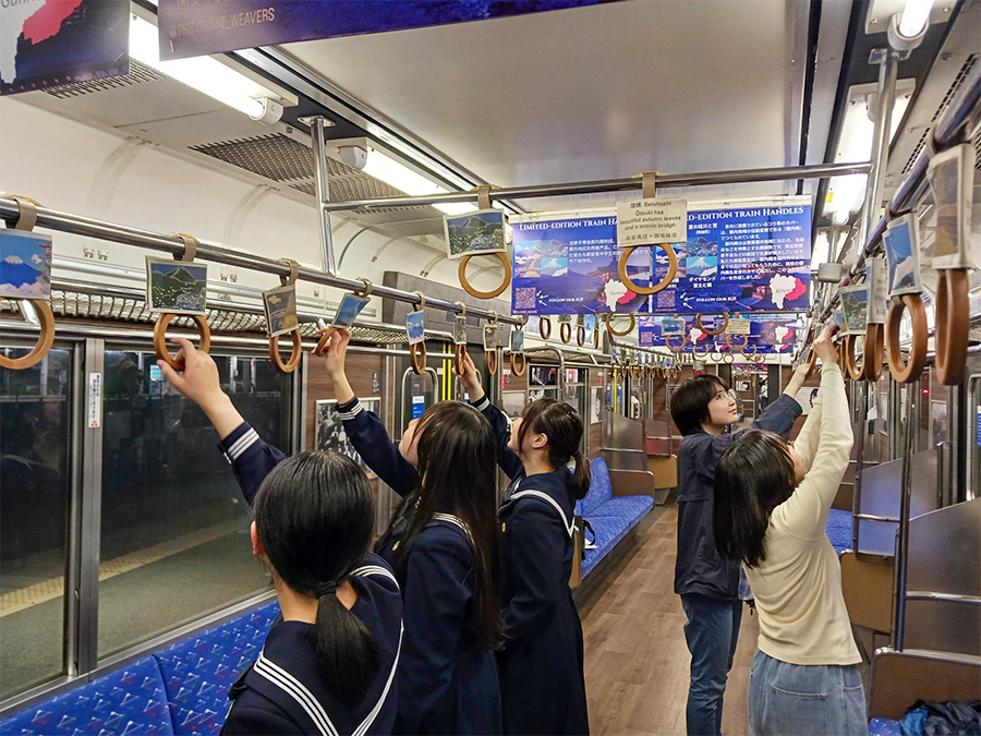 車内のつり革に織物カバーを装飾した「郡内テキスタイル列車」が運行開始しました。