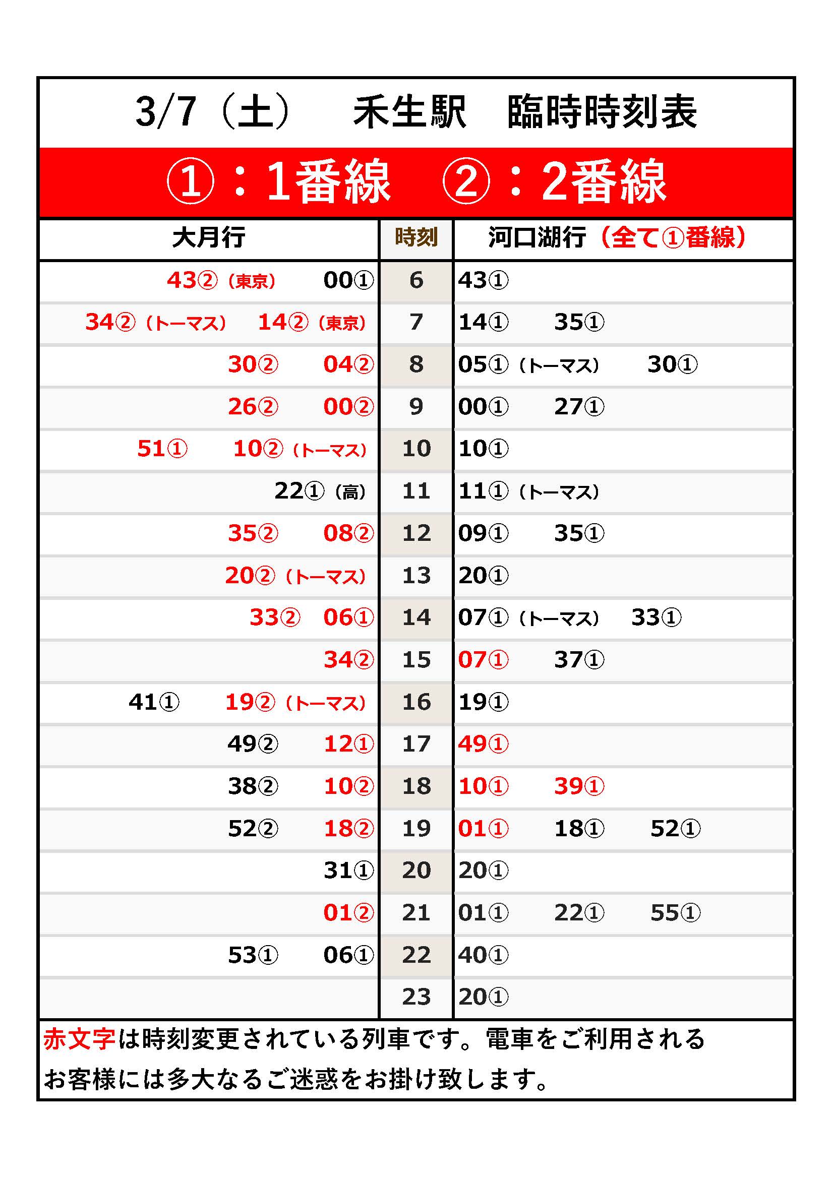 3月5日に発生した富士急行線内での車両脱線による影響で、現在上大月駅、田野倉駅、禾生駅の運転ダイヤや到着番線が通常と異なります。